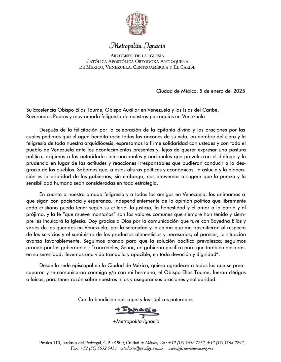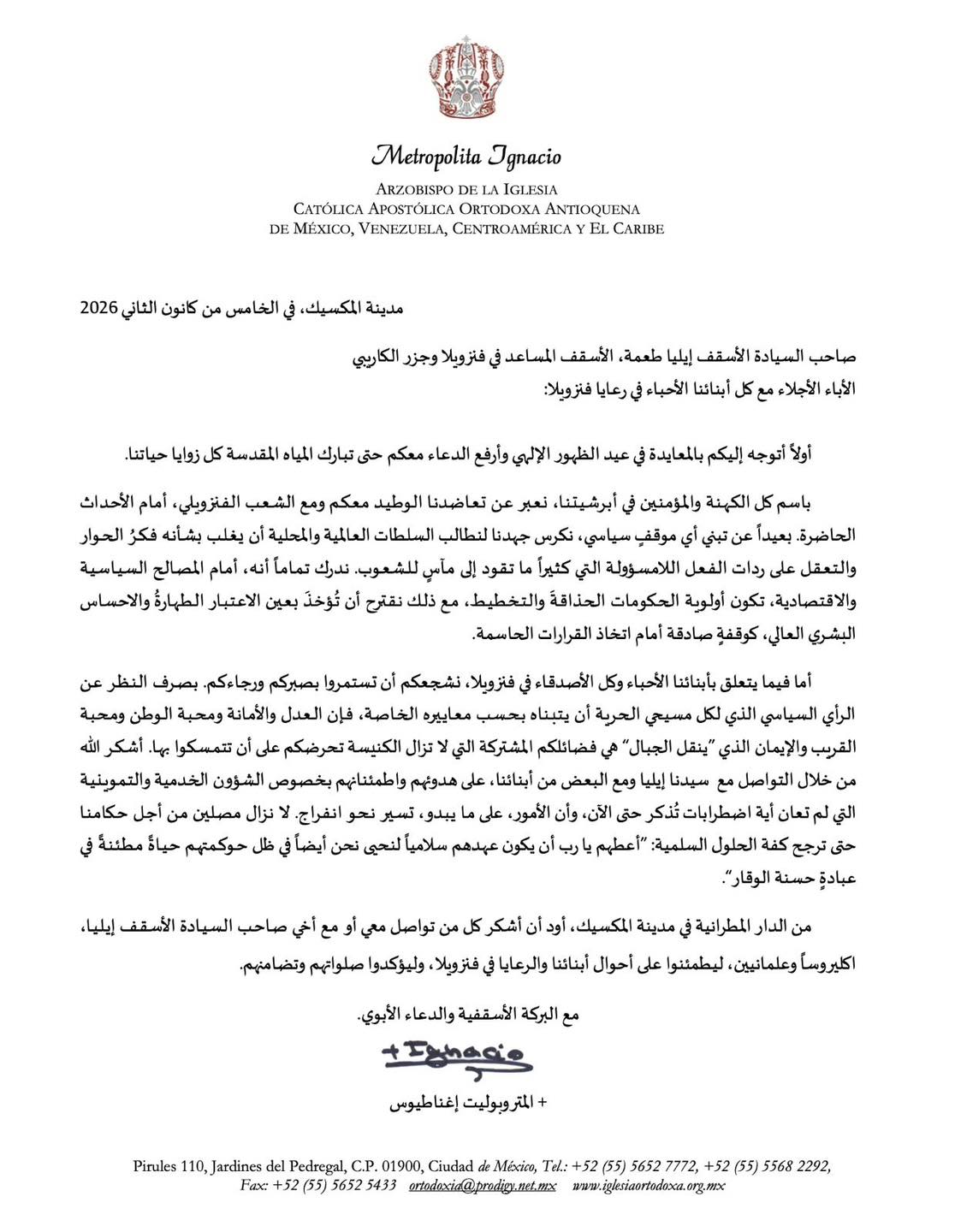 Comunicado de S. E. Metropolita Ignacio para con la feligresía en Venezuela.
